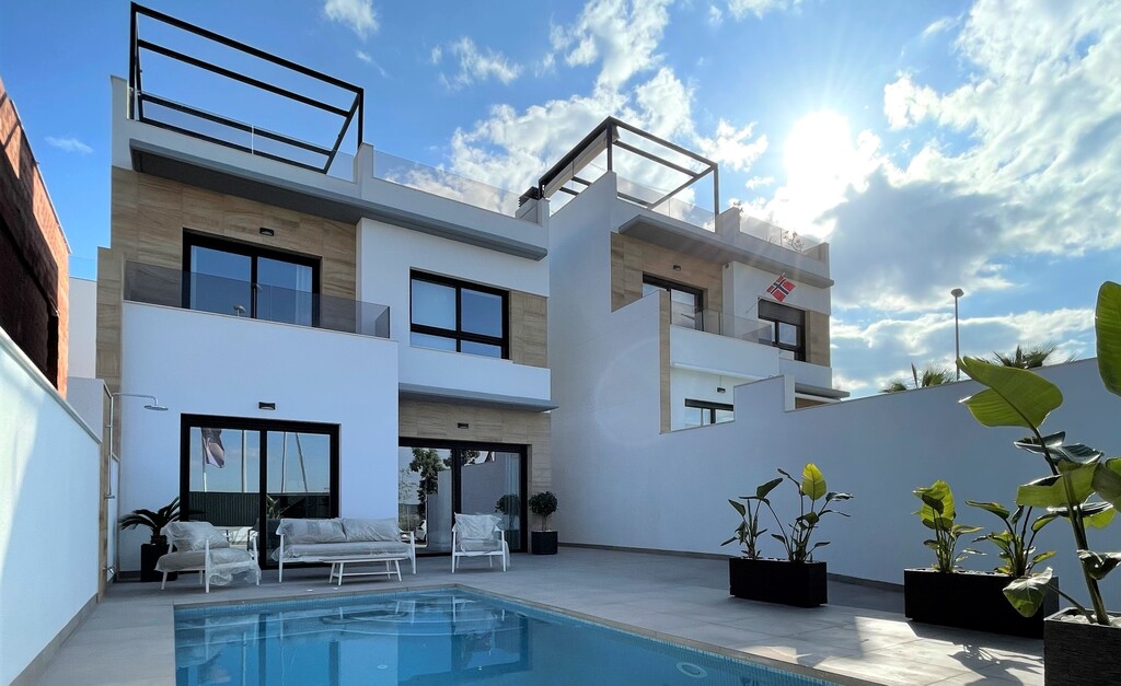 Moderne, erg mooie Villa’s afgewerkt met materialen van zeer hoge kwaliteit met 3 slaapkamers en 3 badkamers, een grote tuin met een zwembad inclusief een jacuzzi gedeelte met Jet-streams en een buitenkeuken in het dorpje Benijofar.