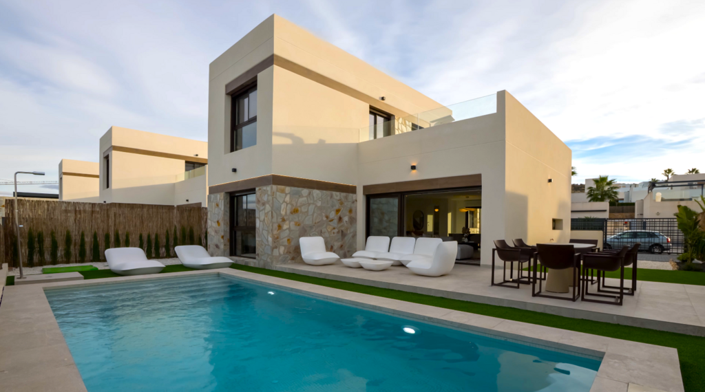 Moderne Villa’s met 4 slaapkamers en 3 badkamers met een grote tuin rondom van minimaal 200 m2 op het mooie Vistabella Golf Resort. Het is een afgesloten en bewaakte urbanisatie. En natuurlijk een eigen zwembad met buitendouche.